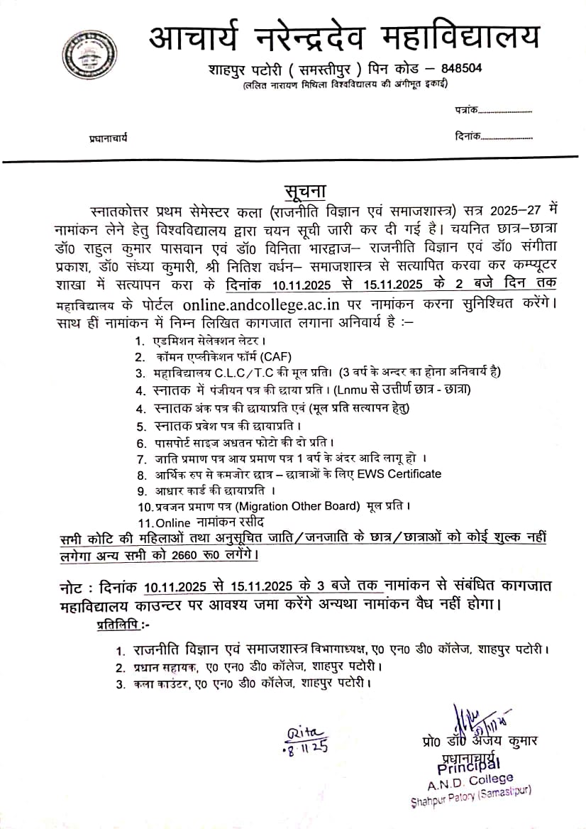 NOTICE REGARDING PG 1ST SEMESTER ADMISSION (2025-27)